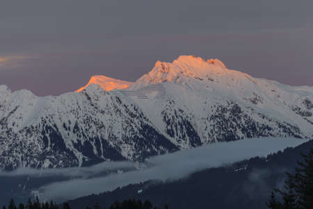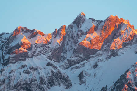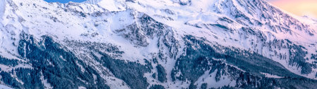 Panoramic view of snowy mountains ranges at sunrise or sunset. Calm and relaxing nature mountainous natural scenery. Nature background landscape with orange and warm colors in the mountains at dusk.