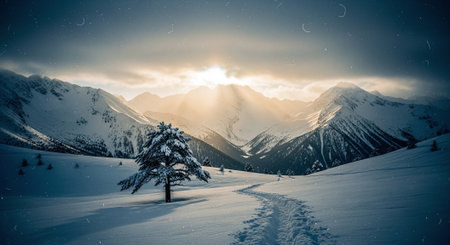 Majestic mountain peak rises high above tranquil meadow in winter generated by artificial intelligence