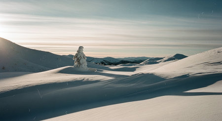 Serene Snow-Covered Mountains at Sunrise with Soft Light and Gentle Slopes in a Peaceful Winter Landscape