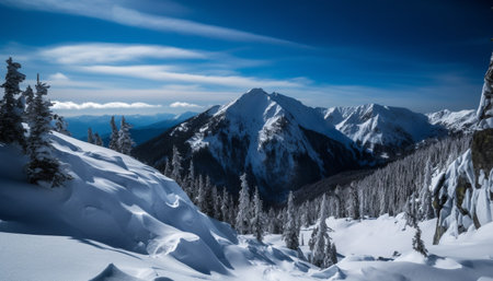 Majestic mountain peak in panoramic winter landscape, perfect for hiking generated by artificial intelligence