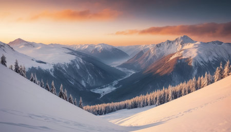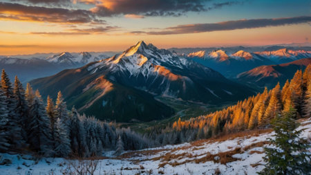 Snow-capped mountains merge with a colorful sunset, revealing a serene valley below while pine trees line the slopes.
