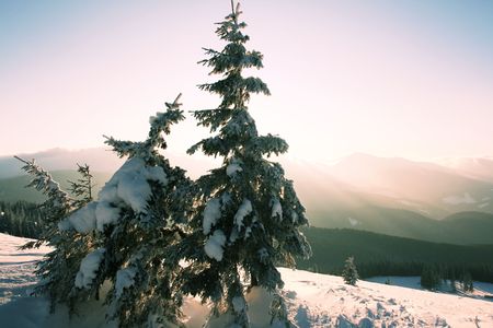 Snowy pine tree in mountains at sunset. Beautiful winter landscape.