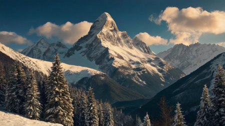 Experience the majestic beauty of a snow-covered mountain bathed in sunlight. Ideal for travel, adventure, and nature themes, this scene evokes feelings of freedom, peace, and exploration. Use this to create stunning visuals for your projects.