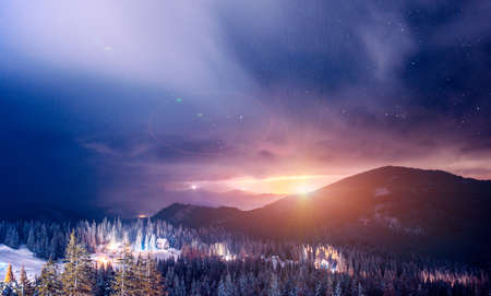 The resort ski resort illuminated at night is located in a picturesque place above a clear starry sky. Country Vacation Concept. Place for text