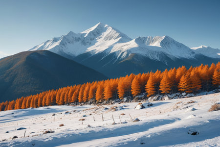 Snowy orange forest at the foot of the snow capped mountains