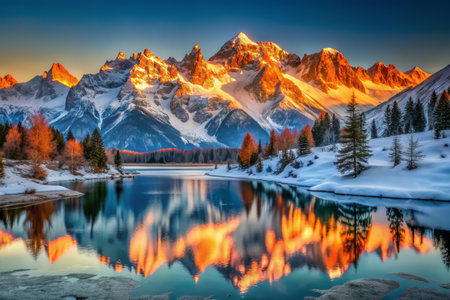 Vibrant orange sunset illuminates snow-capped peaks of majestic mountain range, with misty valleys and frozen lakes, set against a serene crystal clear blue sky.