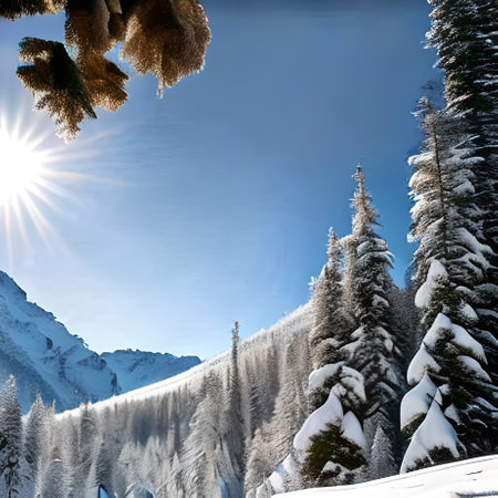 Majestic snow-covered mountains create a serene winter landscape with evergreen trees bathed in sunlight.