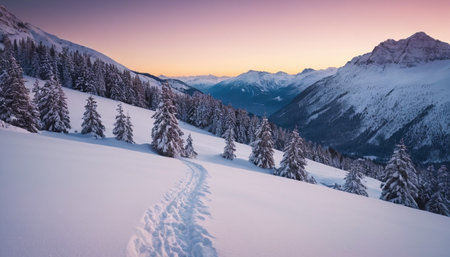 A serene winter landscape with snow-covered mountains, pine trees, and a winding path leading into a valley at sunset.