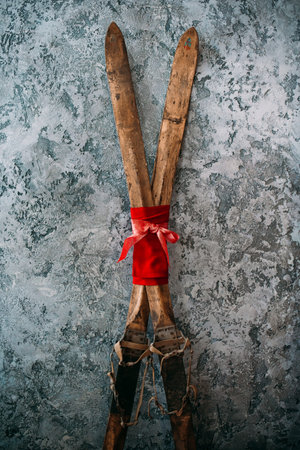 Overhead view of ski accessories placed on rustic old wooden table. Items included ski, goggles and ski sticks. Winter sport leisure time concept.