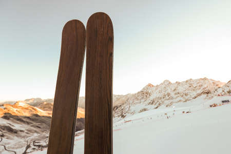 A pair of wooden skis in a morning sun in front of an alpine panorama.