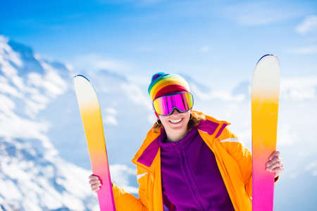 Young active woman skiing in mountains. Female skier kid with safety helmet, goggles and poles enjoying sunny winter day in Swiss Alps. Ski race for adults. Winter and snow sport in alpine resort.