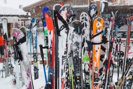French Alps. Skis and snowboards. Saint Gervais. France.