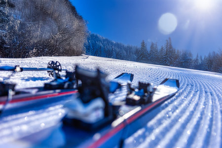 Close-up low angle shot of skis on a perfect corduroy snow surface with bright morning sun and lens flare in Jasna ski resort, Slovakia.