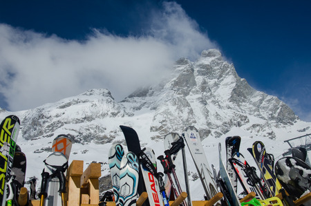 ITALY - MARCH 2016: Nice view of the Matterhorn peak from Cervinia ski resort in March 8, 2016, Italy. Matterhorn is a huge and near-symmetrical pyramidal peak in the Pennine Alps, one of the highest summits in the Alps and Europe.