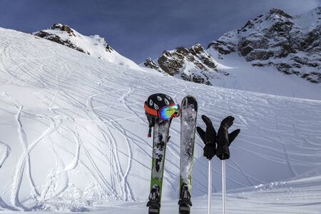 Winter ski resort in Alps mountains. Ski equipment in the snow on the slope.
