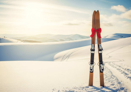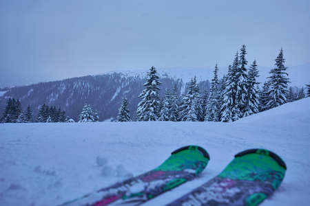 Pair of skis in snow covered ridge. Winter landscape in the background.