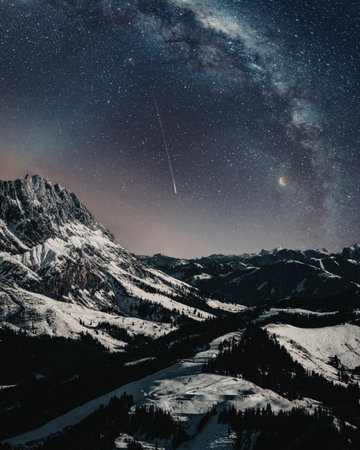 A breathtaking view of a starry night sky with the Milky Way galaxy stretching across the horizon, illuminating a serene landscape of snow-covered mountains and valleys.