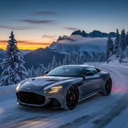 A silver sports car navigates a snow-covered road against a backdrop of mountains and a vibrant sunset. The composition highlights the car's design, with a focus on its headlights. The scene evokes a sense of adventure, possibly suitable for automotive marketing or travel-related content, and demonstrates a blend of natural and manufactured elements.