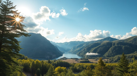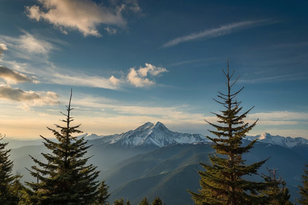 A stunning view of a snow-capped mountain rising majestically above a misty forest, capturing the serene beauty of nature at dawn. The peaceful landscape invites exploration and adventure.