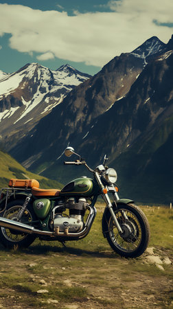 Beautiful view of a mountain lake with a motorcycle in the foreground