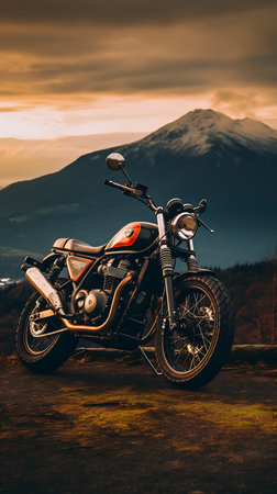 Sleek Modern Motorcycle Against Mountain Landscape Backdrop at Dusk