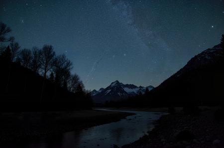 Breathtaking view of a mountain range silhouetted against a dark blue, starry night sky, creating a serene and awe inspiring landscape