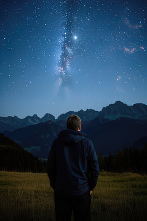A lone observer stands on a rugged mountain trail, gazing at a magnificent Milky Way stretching across the starry night sky.