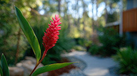 A stunning red ginger flower stands prominently against a backdrop of lush greenery, showcasing nature's beauty in a tranquil outdoor setting. The scene captures a peaceful pathway, bathed in soft light, inviting serenity.