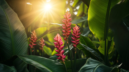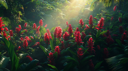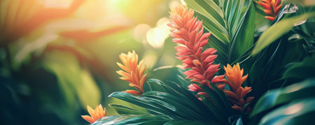 Tropical foliage with vibrant bromeliad flowers, serene natural backdrop. Exotic plant life and tranquility concept
