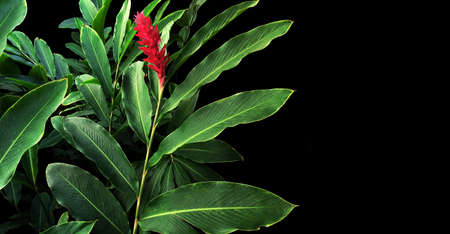 Green leaves with red flower bloom of red ginger (Alpinia purpurata), tropical forest plant on black background.