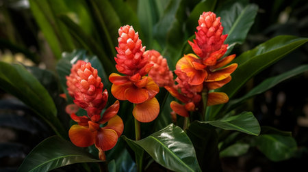 A close-up of vibrant red ginger flowers in full bloom, with their glossy green leaves providing a lush background.