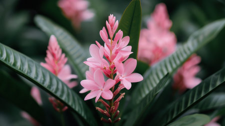 A captivating close-up of a vibrant pink ginger flower emerging from lush tropical foliage, showcasing the beauty of nature and its intricate details.