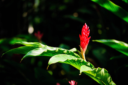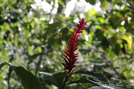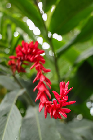 Red ginger flowers growing on plants at tropical forest in Costa Rica