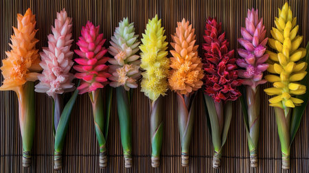 A collection of colorful ginger flowers arranged in a row on a bamboo mat, ready for a tropical display.