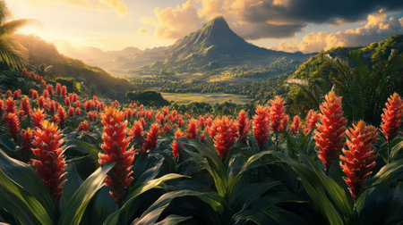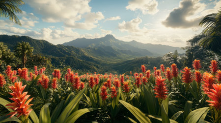A landscape filled with red and orange ginger flowers, with a tropical mountain in the distance.