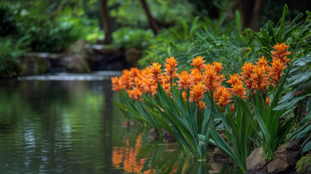 Bright orange ginger flowers blooming along a riverbank, their colors reflecting in the water.