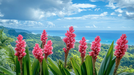 Pink and red ginger flowers in a tropical landscape, with the ocean visible in the distance.