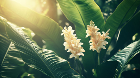 Bright yellow ginger flowers blooming against a backdrop of deep green leaves, showcasing their unique shapes.