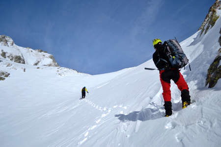 expedition of mountaineers in the mountains all snowy and well equipped, winter concept