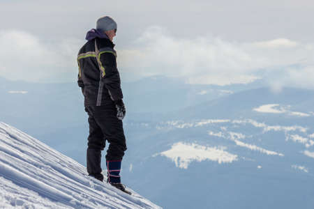 Silhouette of alone tourist standing on snowy mountain top enjoying view and achievement on bright sunny winter day. Adventure, outdoors activities and healthy lifestyle concept.