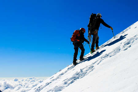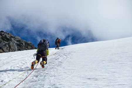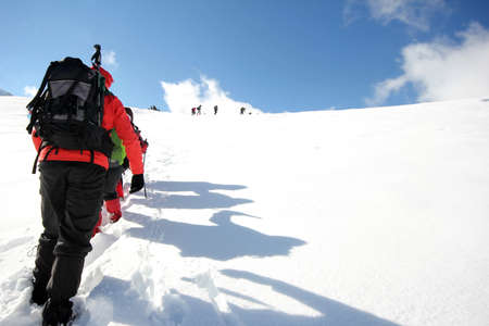 Group of mountain hikers in single file go up the snowy peak. In the background the cloudy blue sky.