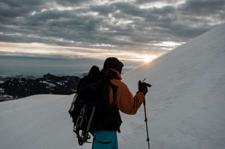 Rear view man with hiking equipment climbing on the snow on the mountain hill