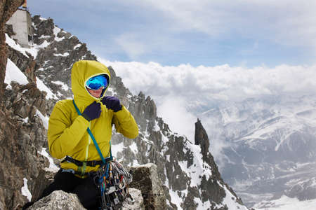 Extreme winter sports: climber at the top of a snowy peak in the Alps. Concepts: determination, success, brave.