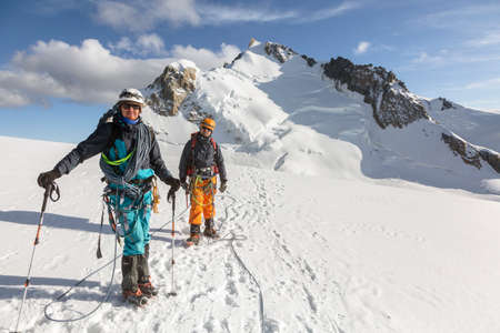 Two mountaineers on hike in snow mountains, Alps, Europe.