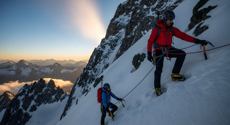 Two mountaineers, roped together for safety, ascend a steep, snowy mountain face using ice axes and crampons. The dramatic sunrise or sunset casts a warm glow over the distant alpine landscape, highlighting the adventure and challenge of mountaineering.