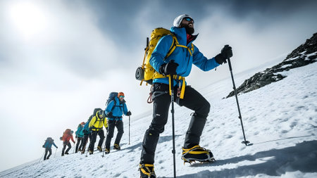 Ascent to the Summit: Mountaineers' Challenge Against Snowy Slopes. Generative ai. High quality illustration