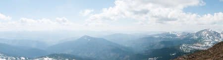 A beautiful panoramic view of the snow-capped mountains of the Carpathians from the top of Goverly in spring in a beautiful sunny day with light clouds. Carpathians, Goverla, Ukraine