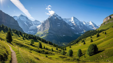Panoramic view of the alpine meadows and snow-capped peaks of the Swiss Alps