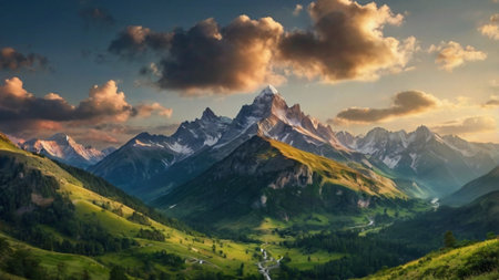 Lush green valleys and charming cottages nestle among majestic mountains under a bright sky, creating a serene scene during a sunny day in the countryside..
