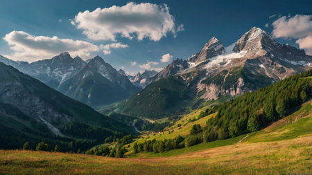 Beautiful alpine landscape with snow-capped mountain peaks.